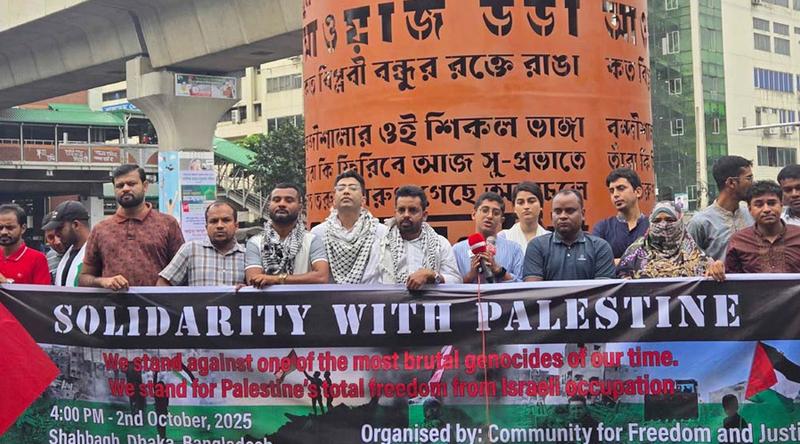 ফিলিস্তিনের স্বাধীনতা সংগ্রামের প্রতি সংহতি জানিয়ে ও ‘গ্লোবাল সুমুদ ফ্লোটিলা’ নৌবহরের ওপর ইসরায়েলি সৈন্যদের হামলার প্রতিবাদে মানববন্ধন করেছে মানবাধিকার সংগঠন কমিউনিটি ফর ফ্রিডম অ্যান্ড জাস্টিস।