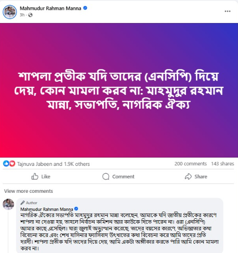 মান্নার এ পোস্ট নিজের ভেরিফায়েড ফেসবুক পেজে শেয়ার করে ধন্যবাদ ও কৃতজ্ঞতা জানিয়েছেন এনসিপির উত্তরাঞ্চলের মুখ্য সংগঠক সারজিস আলম।