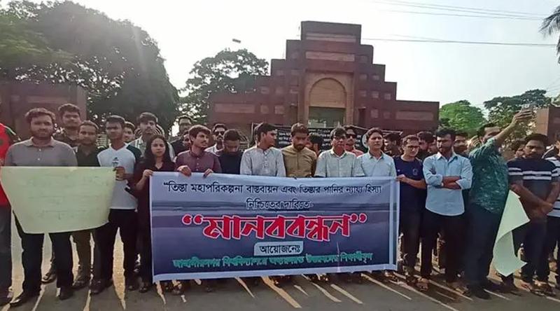 তিস্তা পরিকল্পনা বাস্তবায়ন ও নদীর পানির হিস্যা নিশ্চিতের দাবিতে মানববন্ধন করেছেন জাহাঙ্গীরনগর বিশ্ববিদ্যালয়ের (জাবি) শিক্ষার্থীরা।