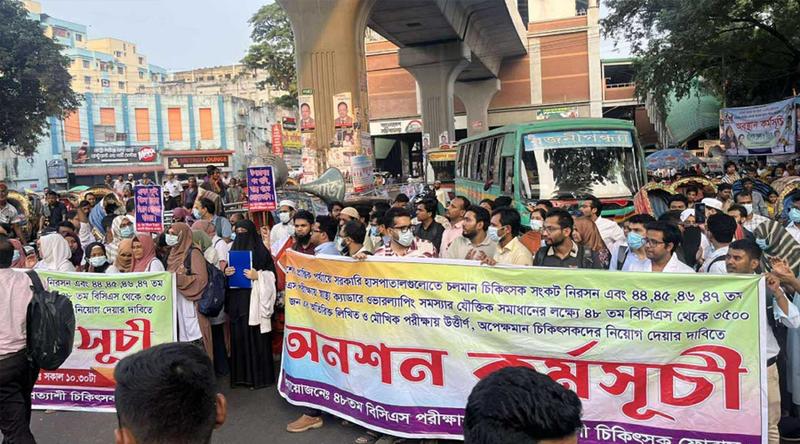 ৪৮তম বিসিএস থেকে ৩৫০০ জনের অতিরিক্ত লিখিত ও মৌখিক পরীক্ষায় উত্তীর্ণ এবং অপেক্ষমাণ চিকিৎসকদের নিয়োগ দেওয়ার দাবিতে অনশন কর্মসূচি পালন করছে ৪৮তম বিসিএস পরীক্ষায় নিয়োগপ্রত্যাশী চিকিৎসক ফোরাম। কর্মসূচির মধ্যেই জাতীয় প্রেস ক্লাবের সামনে সড়ক অবরোধ করেন তারা।