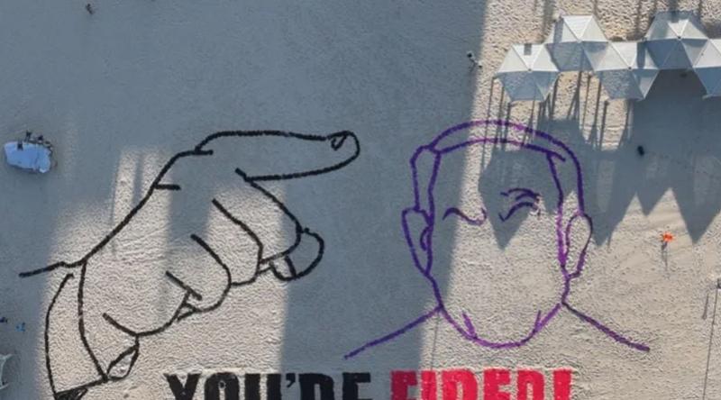 ড্রোনে ধারণ করা দৃশ্যে দেখা যায়—নেতানিয়াহুর একটি প্রতিকৃতি। নেতানিয়াহুর প্রতিকৃতির নিচে লেখা রয়েছে 'you are fired', অর্থাৎ ‘তোমাকে বরখাস্ত করা হলো’।