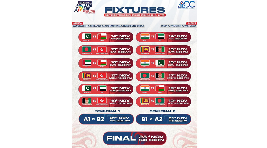 আগামী ১২ থেকে ২৫ নভেম্বর কাতারের দোহায় অনুষ্ঠিত হবে এশিয়া কাপ রাইজিং স্টারস চ্যাম্পিয়নশিপ। এবারের টুর্নামেন্ট ৮ দল নিয়ে হবে। মূলত ২০২৪ সাল থেকে ‘এ’ দলের খেলা হয়ে গেছে ইমার্জিং এশিয়া কাপ। লিস্ট ‘এ’ স্বীকৃতিপ্রাপ্ত এই টুর্নামেন্টের নাম পরিবর্তন করে এবার হয়েছে রাইজিং স্টার্স।