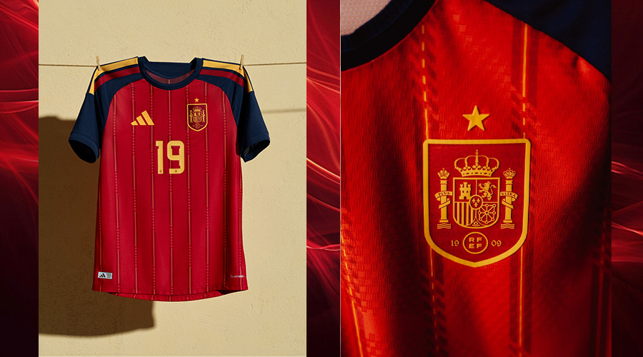 ইউরোপীয় চ্যাম্পিয়ন স্পেনের নতুন কিটে লাল-হলুদের সঙ্গে ফিরেছে গাঢ় নীল হাতা ও সূক্ষ্ম উল্লম্ব পিনস্ট্রাইপ। সরল অথচ ক্লাসিক ডিজাইনে পরিপূর্ণ এই কিটকে বলা হচ্ছে “নির্ভরযোগ্য কিন্তু মার্জিত”।