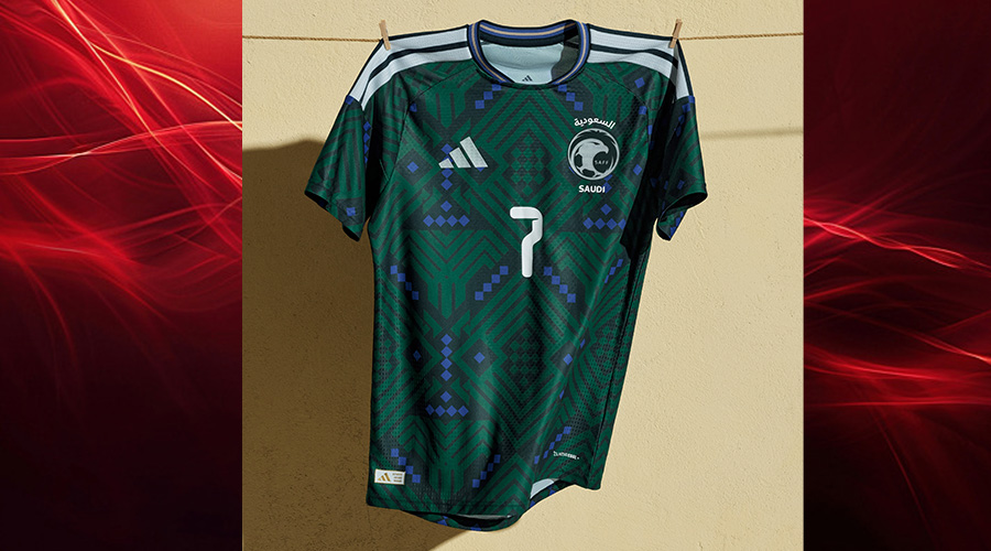 গভীর সবুজ বেসে হালকা শেডের ডায়মন্ড নকশা ও বেগুনি অ্যাকসেন্ট-সৌদি আরবের জার্সি এবার আরও আধুনিক ও দৃষ্টিনন্দন। বিগত কয়েক বছর ধরে তারা স্টাইল এক্সপেরিমেন্টে দারুণ সফল।