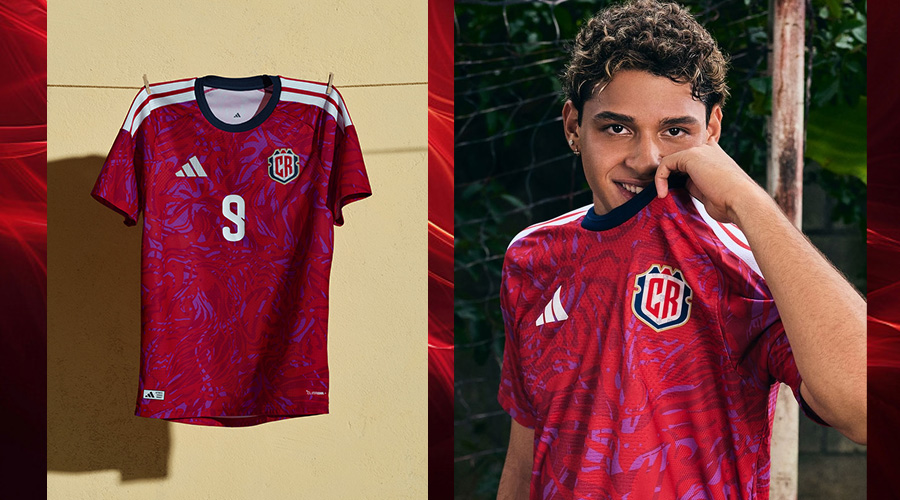 কোস্টারিকার নতুন হোম জার্সি রঙ, সংস্কৃতি ও জীবনের উদযাপন। লাল, নীল ও গোলাপি ছোঁয়ায় সাজানো জার্সিজুড়ে পাতার, টুকান পাখি ও হাসির নকশা যেন উচ্ছ্বাসে ভরপুর এক ট্রপিক্যাল গল্প। গলার পেছনে খোদাই করা আছে দেশের জীবনের প্রতীকী বাক্য ‘পুরা ভিদা’-যা আনন্দ ও প্রাণচাঞ্চল্যের প্রতীক।