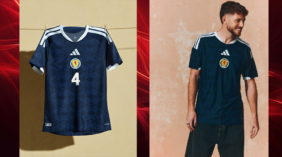 স্কটল্যান্ডের হোম জার্সিতে স্যালটাইর (জাতীয় পতাকা) প্রধান আকর্ষণ। দেশের আইকনিক পতাকাটিকে গাঢ় নীল রঙের সাহসী পুনরাবৃত্তি প্যাটার্নে রূপান্তর করা হয়েছে, যা ক্লাসিক নেভি বেসের সঙ্গে মিশে গেছে। স্কটিশ ফুটবলের ঐতিহ্য নতুন রূপে এবং একটি তাজা ছোঁয়ায় প্রতিফলিত হয়েছে, যা স্কট ম্যাকটমিনের নতুন উজ্জ্বল উপস্থিতির জন্য উপযুক্ত।