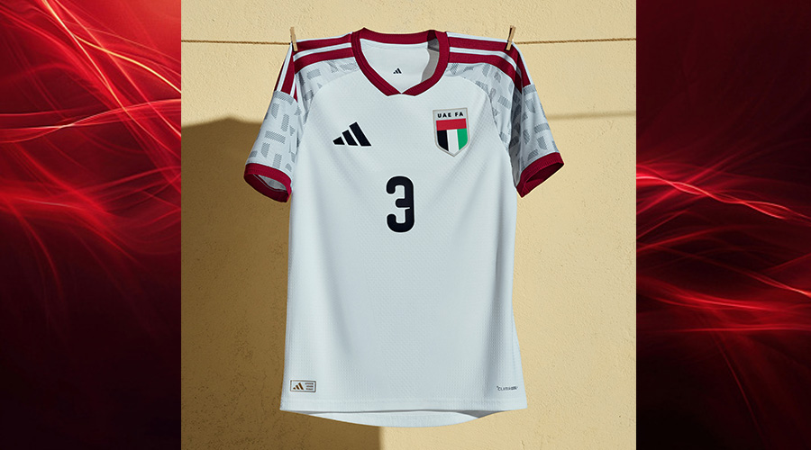 সংযুক্ত আরব আমিরাতের হোম জার্সি এসেছে পরিষ্কার ও আত্মবিশ্বাসী স্টাইলে। সাদা বেসে সাহসী লাল অ্যাকসেন্ট এবং টপে স্টাইলিশ ধূসর গ্রাফিক ব্যবহৃত হয়েছে। জ্যামিতিক প্যাটার্নটি ফেডারেশনের ক্রেস্টের ঢাল আকৃতি থেকে অনুপ্রাণিত, যা জাতীয় পরিচয়কে প্রতিফলিত করে।