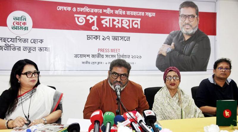 আসন্ন ত্রয়োদশ জাতীয় সংসদ নির্বাচনে স্বতন্ত্রপ্রার্থী হিসেবে ঢাকা-১৭ আসন থেকে নির্বাচন করার ঘোষণা দিয়েছেন শহীদ চলচ্চিত্রকার ও সাহিত্যিক জহির রায়হানের ছেলে তপু রায়হান। রবিবার রাজধানীর জাতীয় প্রেস ক্লাবের আবদুস সালাম হলে আয়োজিত এক সংবাদ সম্মেলনে নির্বাচনে লড়ার ঘোষণা দেন তপু রায়হান।