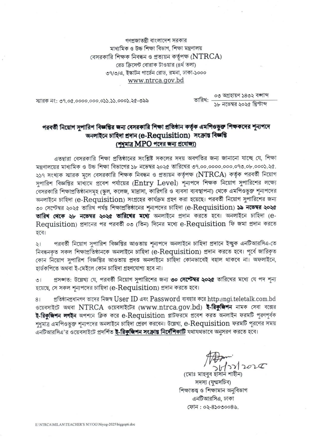 বিজ্ঞপ্তিতে বলা হয়, বেসরকারি শিক্ষক নিবন্ধন ও প্রত্যয়ন কর্তৃপক্ষ কর্তৃক পরবর্তী নিয়োগ সুপারিশ বিজ্ঞপ্তির মাধ্যমে প্রবেশ পর্যায়ের শূন্যপদে শিক্ষক নিয়োগ সুপারিশের লক্ষ্যে বেসরকারি শিক্ষাপ্রতিষ্ঠানসমূহ (স্কুল, কলেজ, মাদরাসা, কারিগরি ও ব্যবসায় ব্যবস্থাপনা) থেকে এমপিওভুক্ত শূন্যপদের অনলাইনে চাহিদা সংগ্রহের কার্যক্রম গ্রহণ করা হয়েছে।