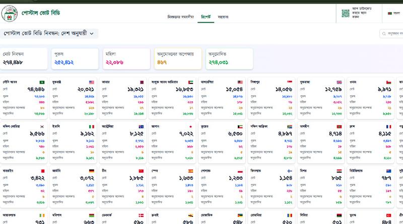মঙ্গলবার (০৯ ডিসেম্বর) সকালে ইসির ওয়েব সাইট (https://portal.ocv.gov.bd/report/by-country) থেকে বিষয়টি জানা গেছে। এবারই প্রথমবারের মতো আইটি সাপোর্টেড পোস্টাল ব্যালটে ভোট নেওয়ার উদ্যোগ নিয়েছে ইসি। এক্ষেত্রে প্রবাসী, আইনি হেফাজতে থাকা ব্যক্তি, ভোটের দায়িত্বে নিয়োজিতরা এ ব্যবস্থায় ভোট দিতে পারবেন। এজন্য অ্যাপে নিবন্ধন করতে হবে। গত ১৯ নভেম্বর থেকে নিবন্ধন শুরু হয়েছে, যা চলবে ২৩ ডিসেম্বর পর্যন্ত।