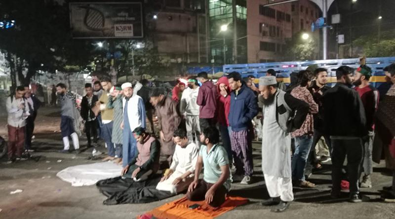 ইনকিলাব মঞ্চের মুখপাত্র শরিফ ওসমান হাদির মৃত্যুর ঘটনায় বৃহস্পতিবার রাত ১১টা থেকে শাহবাগ মোড় অবরোধ করে বিক্ষোভ করছে ছাত্র-জনতা। শুক্রবার ভোরেও সেখান অবস্থান করছে তারা। এসময় ভোরে ফজরের ওয়াক্ত হলে সেখানে নামাজ আদায় করতে দেখা যায় তাদের।