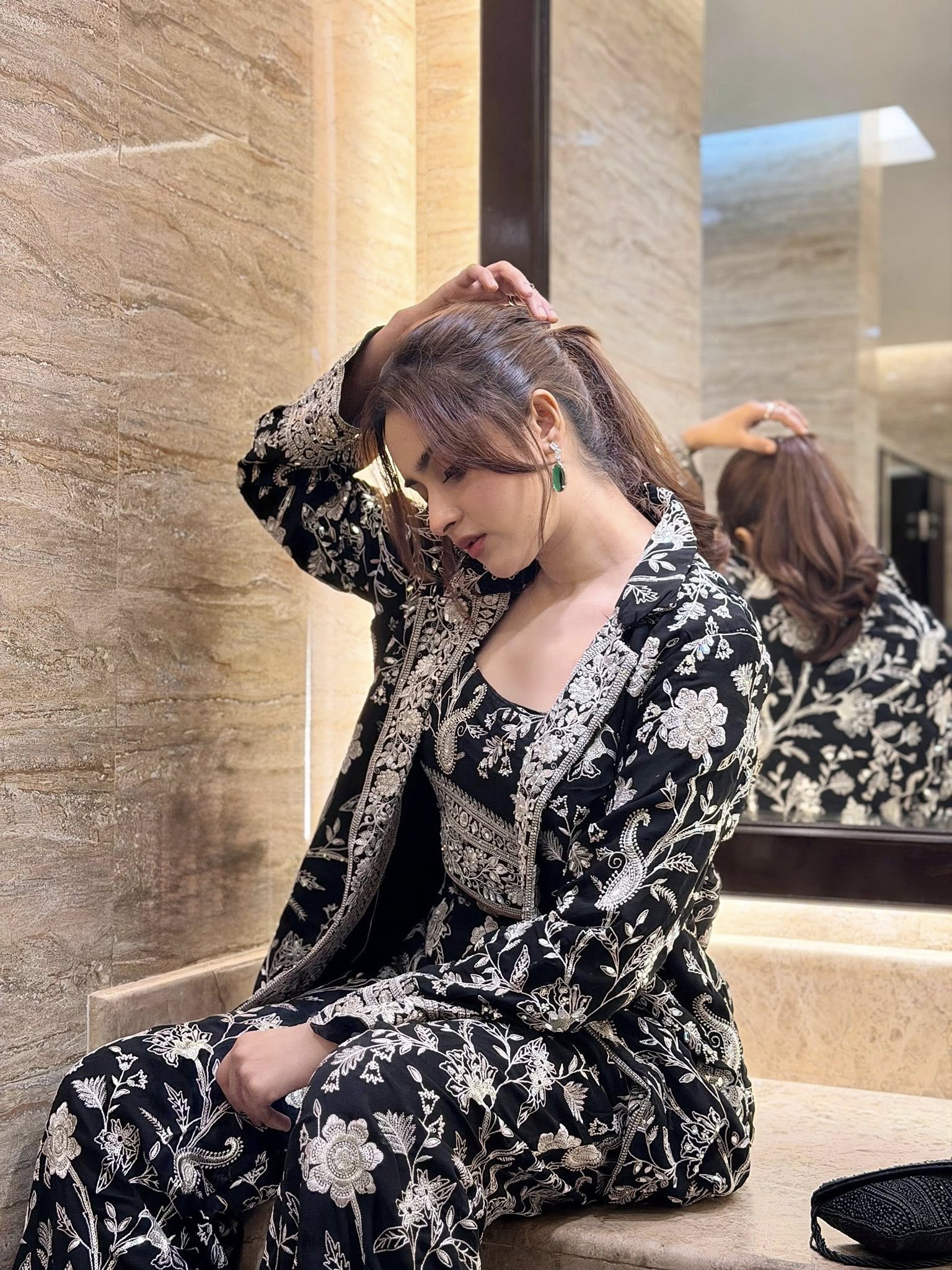তার পরনে ছিল কালো রঙের ওপর সাদা সুতার নিখুঁত ও ভারী নকশা করা একটি টপস এবং ট্রাউজার। এর ওপর আভিজাত্য বাড়িয়ে দিয়েছে একই নকশার একটি ওভারকোট বা জ্যাকেট।