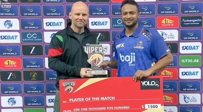 ভাইপার্সের ওপেনার ফখর জামানকে নিকোলাস পুরানের ক্যাচ বানিয়ে প্রথম আইএল টি-টোয়েন্টি উইকেট পান সাকিব। তারপর স্যাম কারানকে ফেরান নিজের দ্বিতীয় ওভারে। চার ওভার বল করে মাত্র ১৪ রান দেন বাঁহাতি স্পিনার। কোনো বাউন্ডারি হজম করেননি, ডট দিয়েছেন ১২টি।