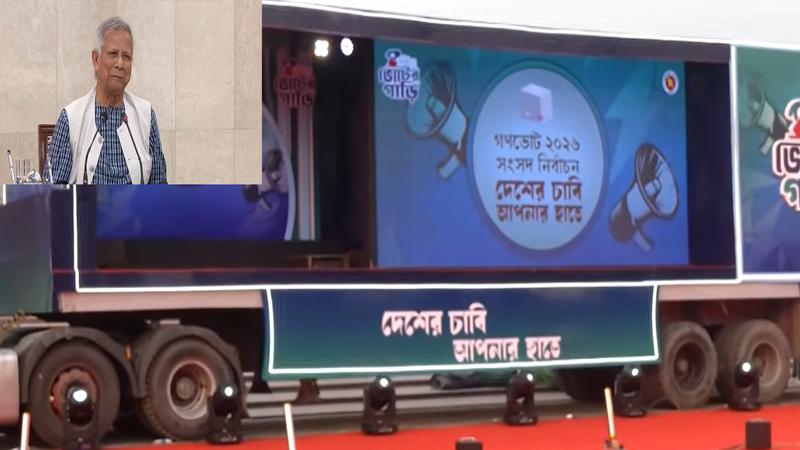 প্রধান উপদেষ্টা বলেন, এ লক্ষ্যকে সামনে রেখে যাত্রা শুরু করেছে ১০টি ভোটের গাড়ি—সুপার ক্যারাভান। এসব গাড়ি দেশের ৬৪টি জেলা ও ৩০০টি উপজেলায় ঘুরে বেড়াবে। তারা মানুষের দুয়ারে দুয়ারে গিয়ে নির্বাচন ও গণভোট সম্পর্কে তথ্য পৌঁছে দেবে, ভোটাধিকার সম্পর্কে সচেতনতা তৈরি করবে এবং গণতন্ত্রের বার্তা ছড়িয়ে দেবে।