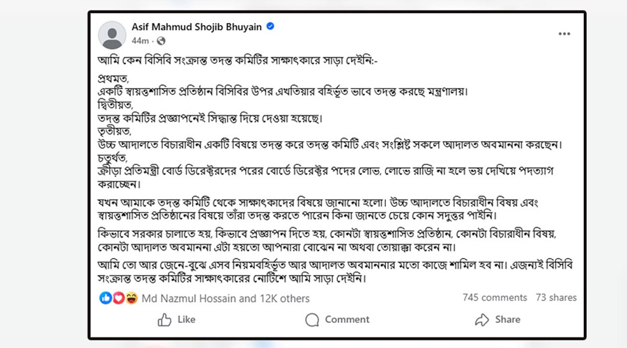 বিসিবির আগের নির্বাচন নিয়ে গত মাসে ৫ সদস্যের তদন্ত কমিটি গঠন করেছিল জাতীয় ক্রীড়া পরিষদ (এনএসসি)। বিসিবির সভাপতি আমিনুল ইসলাম বুলবুলসহ বেশ কয়েকজনের সঙ্গে সাক্ষাৎ করেছেন এই কমিটির সদস্যরা। তারপর আজ (রোববার) এনএসসিতে প্রতিবেদন জমা দিয়েছে কমিটি। কিন্তু সাবেক ক্রীড়া উপদেষ্টা আসিফ মাহমুদ সজীব ভূঁইয়াকে সাক্ষাতের জন্য ডাকা হলেও আসেননি। কেন অনুপস্থিত ছিলেন সেই ব্যাখ্যা দিলেন তিনি এক ফেসবুক পোস্টে।